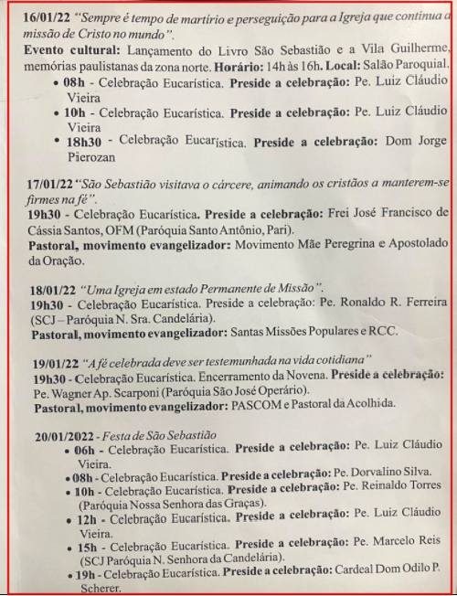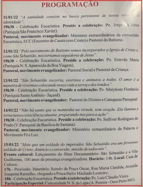 - Período 11 a 19/01/2022 – Novenas prepartórias para a festa de São Sebastião