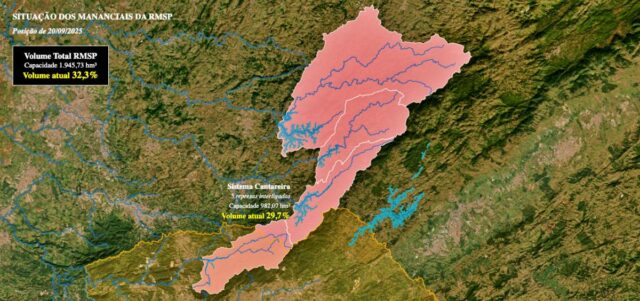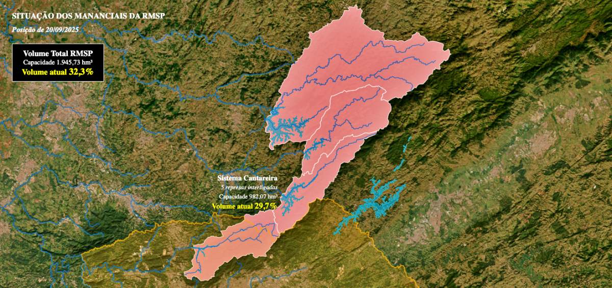 A situação hídrica da Região Metropolitana de São Paulo voltou a preocupar. O Sistema Cantareira, principal responsável pelo abastecimento, registrou neste sábado (20/09/2025) apenas 29,7% de volume útil – índice que mantém os reservatórios na Faixa 4, nível de restrição. Em agosto, choveu apenas 0,2 mm, bem abaixo da média histórica de 79,5 mm. Os dados são da Sabesp.