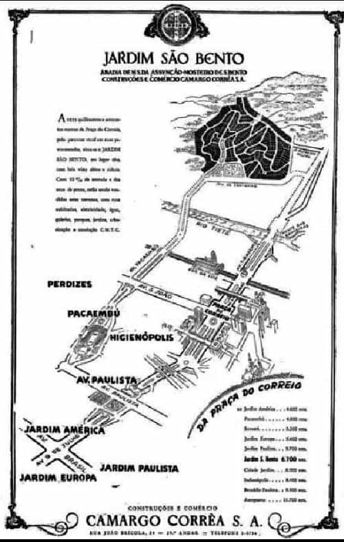 - “A 1111 quilômetros e setecentos metros da Praça da Sé, pelo percurso atual em rua pavimentada, situa-se o JARDIM SÃO BENTO, em lugar alto, com bela vista, arborizado e calmo. Com 10% de entrada e dez anos de prazo, serão vendidos estes terrenos, com ruas asfaltadas, eletricidade, água, galeria, parques, jardins, arborização e condução da C.M.T.C.”
