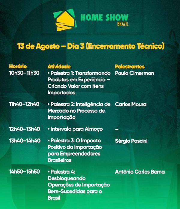“Essa 6ª edição da Home Show Brazil será um marco para o setor de utilidades e decoração. Mais uma vez, estamos unindo empresas brasileiras a fornecedores internacionais em um só lugar. São Paulo, como centro logístico e econômico, é o palco ideal para esse encontro. Nossa expectativa é superar todas as edições anteriores em público e volume de negócios”, declara com otimismo o organizador do evento, Carlos Barrinha.
