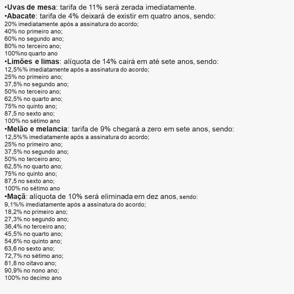 Segundo Luiz Roberto Barcelos, conselheiro da IFPA e diretor da Abrafrutas, o processo de desgravação será escalonado conforme o produto: a uva terá isenção imediata, enquanto melão terá prazo de até sete anos; limão e abacate terão redução ao longo de quatro anos, com queda de 25% ao ano; e a maçã, por ser uma fruta produzida no hemisfério norte, terá o maior prazo, de até dez anos, mantendo um caráter de proteção aos produtores europeus.