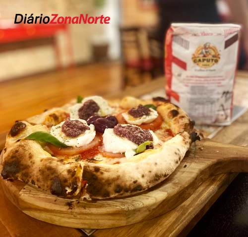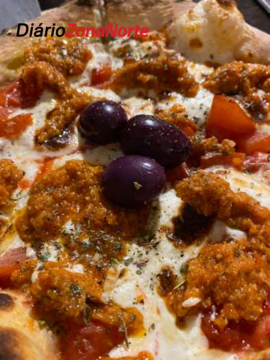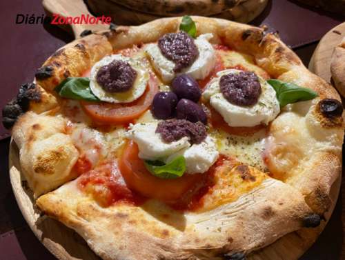 A Caprese é outro destaque. A pizza leva uma base de mozzarella do Queijos Roni, rodelas de tomate, mozzarella de La Bufalina, basílico, finalizada com pesto de azeitonas pretas.