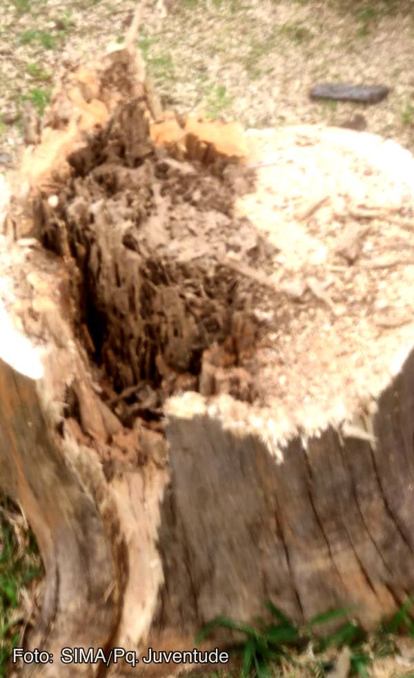 Não deu outra, todas as árvores estavam condenadas e infestadas de cupim. Nos miolos as árvores já estavam ocas, com a ação dos cupins — que começam pelas raízes. E a empresa Nova Era foi contratada para os cortes e a retirada dos tocos das árvores, o que aconteceu nesta 6ª.feira.