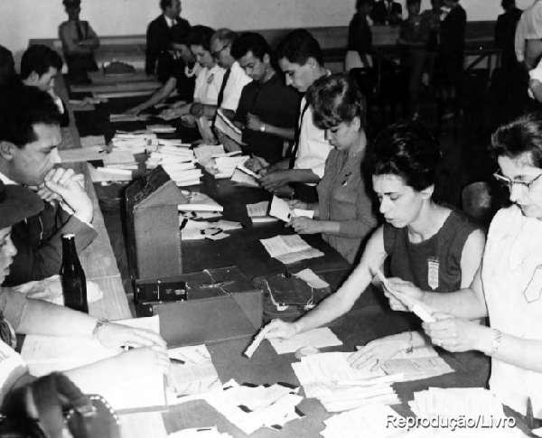 Na época, as cédulas únicas, de papel, que foram usadas nas eleições presidenciais de 1955. No Pavilhão Internacional do Parque Ibirapuera, da época, era o local para a contagem de votos que levaram dias para se obter os resultados finais. Era um momento cansativo para os apuradores e de uma enorme expectativas para os que dependiam dos resultados. Voto a voto, contado e recontado – que ainda ficavam na dependência