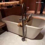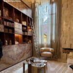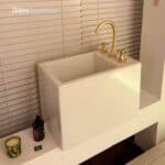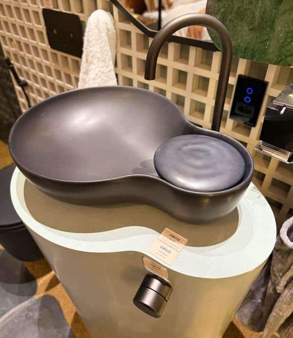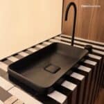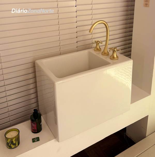 Outro destaque é o bar monolítico, peça central do projeto, que alia praticidade e sofisticação. Equipado com o Monocomando Enjoy Pró — que oferece água filtrada gelada e com gás — e o Monocomando Enjoy Express, que entrega água filtrada e fervente, o bar ainda conta com as cubas Facile Redonda e Suprema Quadrada, dispostas sobre tampo em Petra Calacata Portinari.