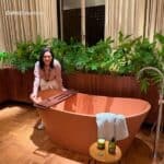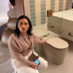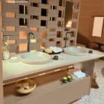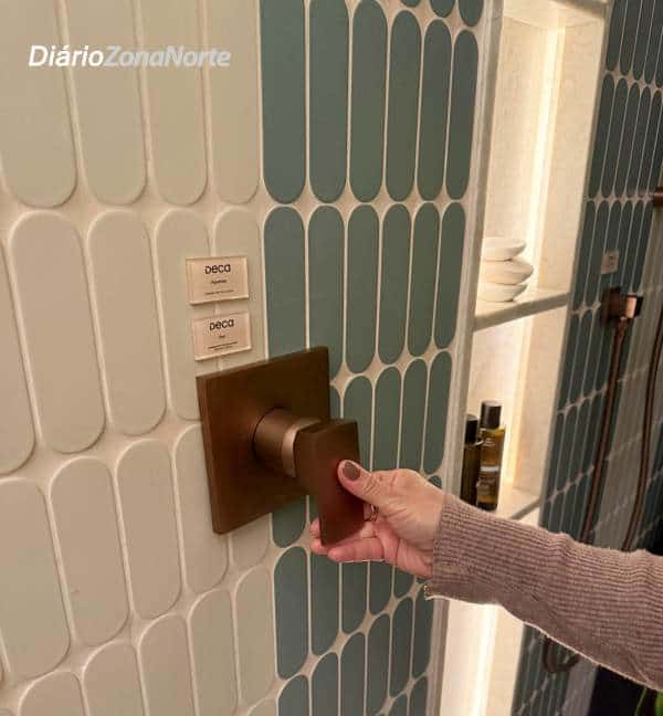 Logo na sequência, um banheiro com portas de vidro e iluminação cênica revela a sofisticação das louças e metais Deca, além da cuba assinada por Jader Almeida.