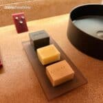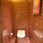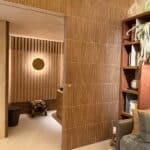 Os revestimentos utilizados têm papel fundamental na atmosfera do espaço. O piso é feito com o Castelatto Matéria, e o balcão recebe o Castelatto Bricks Matéria, ambos compostos com pitcher — um material sustentável proveniente da reciclagem de louças sanitárias trituradas.