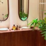 O tampo do balcão, por sua vez, foi produzido com a sofisticada Pietra Sólida Verde Mate da Portinari, também presente na parede lateral do ambiente. A combinação resulta em texturas únicas e um visual delicado, com forte apelo ecológico.