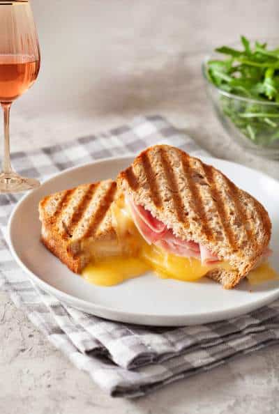 Misto quente com frios da Estado Luso (queijo prato e presunto Royale) harmonizando com o vinho rosé espanhol 99 Rosas – importado pela Casa Flora