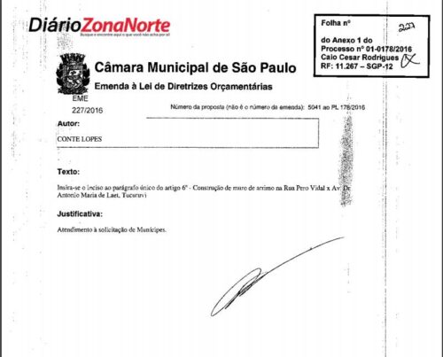 Em 2016, o então vereador Conte Lopes, tentou dar andamento na obra e apresentou ao Projeto de Lei 178/2016 que dispunha sobre orçamento da  Prefeitura de São Paulo para o ano de 2017,  a emenda 227/2016  –  inciso ao parágrafo único do artigo 6º –  pedindo recursos para a “Construção de muro de arrimo na Rua Pero Vidal x Av. Dr Antonio Maria de Laet, Tucuruvi”.   Infelizmente, o pedido do vereador Conte Lopes não foi atendido.