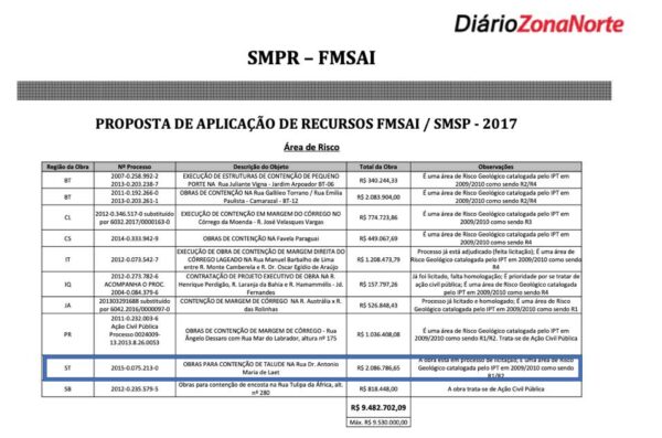 O processo recebeu o número 2015-0.075.213-0 e teve seu custo estimado em R$ 2.086.786,65 – De acordo com a documentação, a  área  foi catalogada em 2009/2010 pelo Instituto de Pesquuisas Tecnológicas – IPT como sendo de Risco Geológico  R1/R2 (baixo e médio risco), com prazo de execução em 120 dias.   Após cinco anos da análise, a situação evoluiu provavelmente para R2/R3 (médio e alto risco)