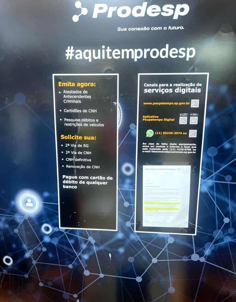 Além dos totens, os serviços eletrônicos estão disponíveis no aplicativo ´´Poupatempo SP.Gov.Br´´e WhatsApp pelo número (11) 9-5220.2974.  Informações sobre documentação necessária, valores de taxas, entre outras, o cidadão obtém no Disque Poupatempo 0800 772 36 33 (ligação gratuita) ou no site do Poupatempo (www.poupatempo.sp.gov.br), no link Guia de Informações Sobre Serviços Públicos.