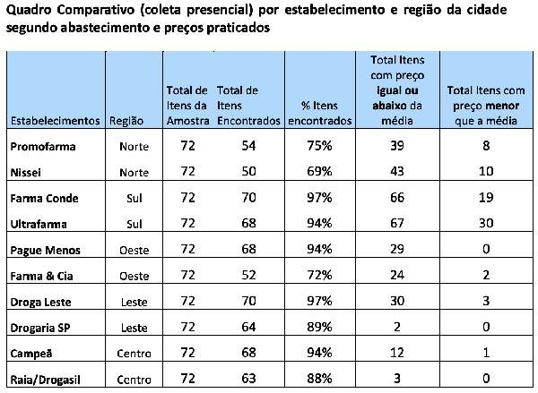O levantamento foi feito entre os dias 26 e 28 de maio de 2025 em farmácias físicas e online da capital. Foram analisados 72 medicamentos em dez estabelecimentos — dois por região da cidade — e, também, 67 itens em sites de nove redes diferentes, a partir de endereços localizados na região central.