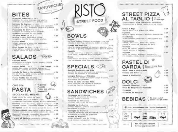 Além dos “Bites & Salads” – com destaque para o Polpettine de costela com maionese de raiz forte, o Ristô Street Food deixa sua marca de DNA italiano nas sessões “Crie sua Pasta” ou “Specials”, com o Gnocchi recheado de brie e gratinado com parmesã, além da Porchetta na Ciabatta, italianíssimo exemplar do “Cibo di Strada”, como é chamada a comida de rua na Itália.