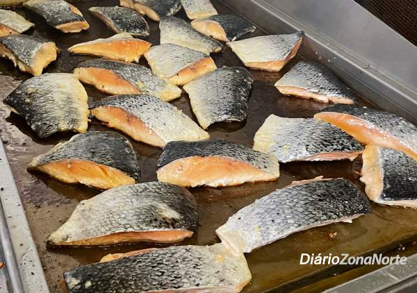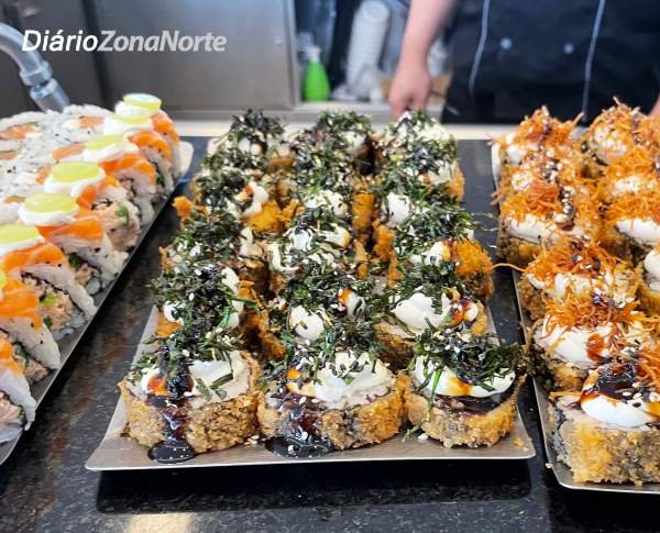 E não deixa por menos, como opção, uma ilha de culinária japonesa em que os clientes pedem as opções em um cardápio variado, desde sushi até yakissoba, sashimi, tempurá, guioza e temaki .