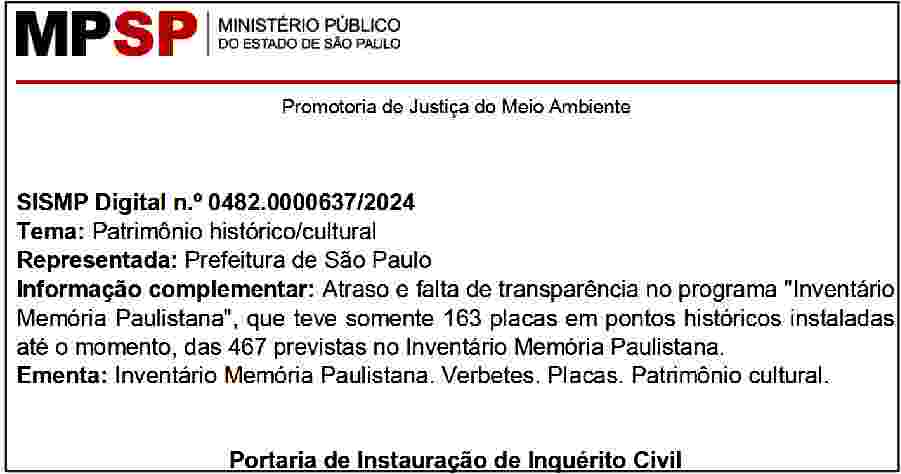 A investigação foi aberta em 20 de fevereiro de 2025 com o seguinte resumo: “Atraso e falta de transparência no programa Inventário Memória Paulistana, que teve somente 163 placas em pontos históricos instaladas até o momento, de um total de 467 previstas (hoje já são 517)”. O caso foi formalmente encaminhado à Secretaria Municipal da Cultura.